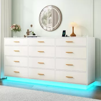 63" Modern LED Dresser with 12 Drawers, Charging Station & RGB Lights