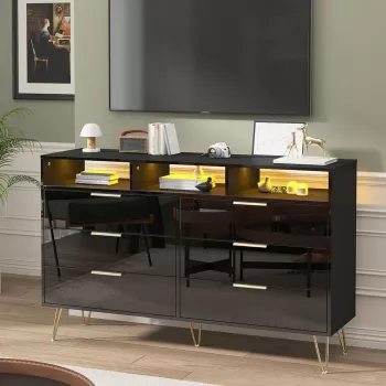 Modern 6 Drawer Dresser with RGB LED Lights and Gold Legs – 55” Wide