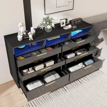 Modern 6 Drawer Dresser with RGB LED Lights and Gold Legs – 55” Wide