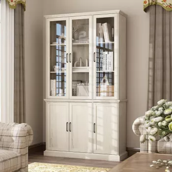 Modern Display Cabinet with Glass Doors – 5-Tier Wood Grain Bookshelf