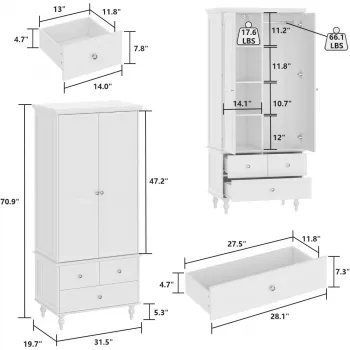 Modern White Wardrobe Closet with 2 Doors, Hanging Rod, Shelves & 3 Drawers